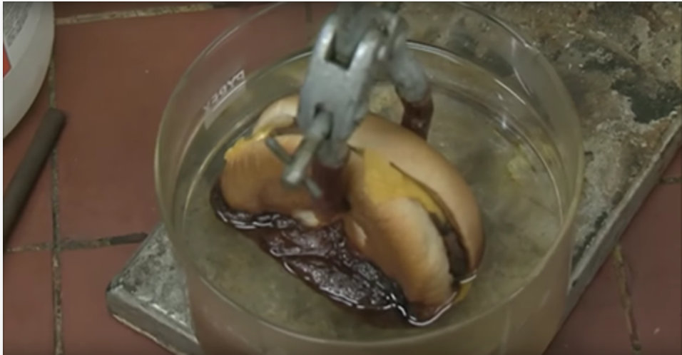Então eles pegaram um genuíno cheeseburger do McDonald’s e mergulharam em ácido clorídrico por três horas e meia.